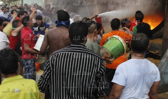 ونشبت اشتباكات عنيفه بالحجارة بين عدد من الأهالى وعناصر من الإخوان ويحاول الآن الأهالى السيطرة على الحريق لحين وصول سيارات قوات الحماية المدنية .