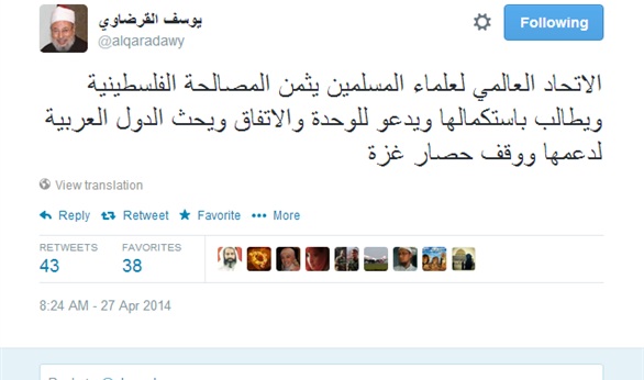 وأضاف: "الاتحاد العالمي لعلماء المسلمين يثمن المصالحة الفلسطينية ويطالب باستكمالها ويدعو للوحدة والاتفاق ويحث الدول العربية لدعمها ووقف حصار غزة".