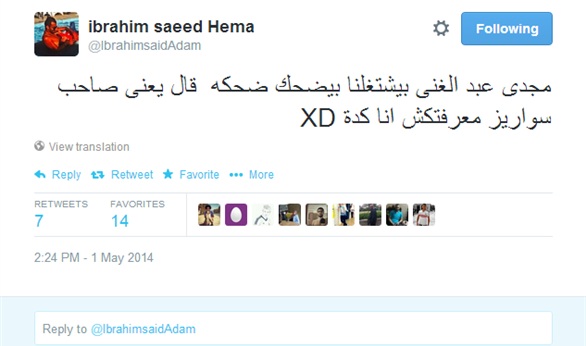 وقال سعيد، فى تغريدة له عبر موقع التواصل الإجتماعى " تويتر" : "مجدى عبد الغنى بيشتغلنا بيضحك ضحكة قال يعنى صاحب سواريز معرفتكش انا كدة".