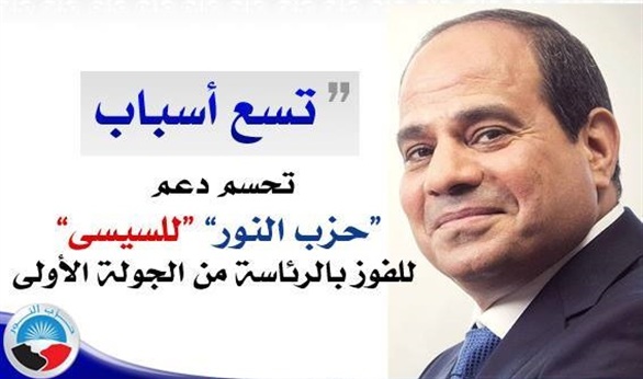 نشر حزب النور الأسباب التسعه التى أدت إلى حسم الرأى حول دعم حزب النور للسيسى للفوز بالرئاسة من الجولة الأولى، والتى تم توضيحها على صفحة رصد حزب النور التابعة للحزب على موقع التواصل الإجتماعى فيسبوك وكانت كالتالى:
