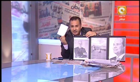 ظهر الإعلامي جابر القرموطي - خلال برنامجه "مانشيت" الذي يعرض علي فضائية "ONtv" - بلوحة عليها صورة للمشير عبد الفتاح السيسي وأخري لحمدين صباحي.