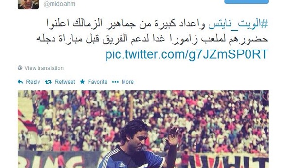 وقال ميدو، فى تغريده له عبر موقع التواصل الإجتماعى " تويتر " : "الويت نايتس واعداد كبيرة من جماهير الزمالك اعلنوا حضورهم لملعب زامورا غدا لدعم الفريق قبل مباراة دجلة".