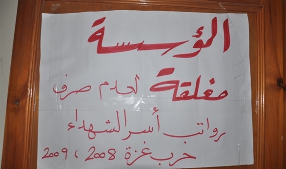 أغلق العشرات من أهالي شهداء حرب 2008-2009 الاسرائيلية على قطاع غزة اليوم الأربعاء مؤسسة رعاية أسر الشهداء التابعة لمنظمة التحرير الفلسطينية ومكتب نواب حركة فتح في غزة واحتجزوا أربعة منهم احتجاجا على عدم صرف رواتبهم.