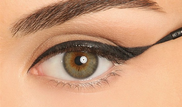 * وضع آيلاينر عريض على جفن صغير وسحب الآيلاينر خارج رسمة العيون بالظل وكذلك تحديد أسفل العين بالآيلاينر بعيدا عن خط العيون من الأسفل.