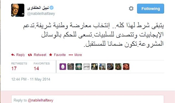 وقال الحفاوى، فى تغريدة له عبر موقع التواصل الاجتماعى "تويتر": يتبقى شرط لهذا كله.. انتخاب معارضة وطنية شريفة. تدعم الإيجابيات وتتصدى للسلبيات. تسعى للحكم بالوسائل المشروعة. تكون ضمانا للمستقبل.