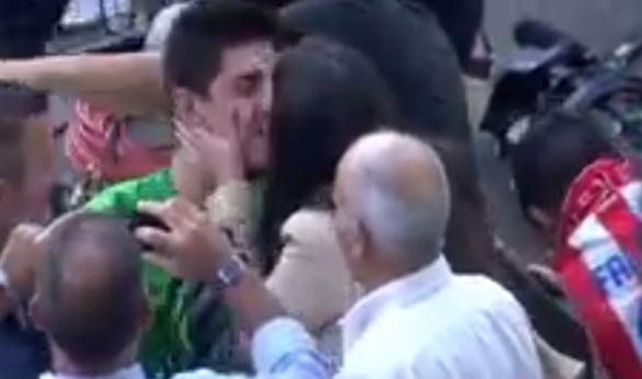فاجأ البلجيكي مارك كورتوا حارس مرمى أتليتكو مدريد المتوج بلقب الدوري الأسباني لكرة القدم الجميع في ملعب الكامب نو باتجاهه إلى المدرجات مسرعا عقب نهاية اللقاء وقام بتقبيل صديقته التي كانت تتابع اللقاء احتفالا بتتويج فريقه بلقب الدوري.