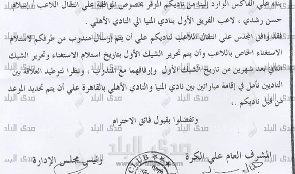 قام مسئولو النادى الاهلى باظهار الفاكس المرسل من نادى المنيا بالموافقة على بيع اللاعب إسلام رشدي للقلعة الحمراء بعد تسديد قيمة الشرط الجزائى الذى يبلغ نصف مليون جنيه وهم عكس ما يردده مجلس ادارة النادى الصعيدى بالموافقة على بيع اللاعب الى نادى الزمالك الذى تعهد بدفع مليون جنيه .