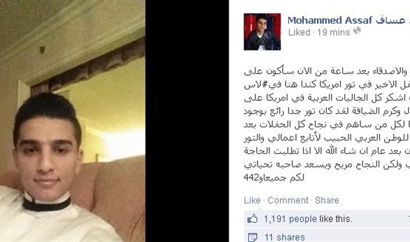 وقال نجم آرب أيدول ما نصه: (تحياتي للأحبة والأصدقاء بعد ساعة من الآن سأكون علی المسرح في الحفل الأخير في تور أمريكا كندا هنا في"لاس فيغاس" أحب أن أشكر كل الجاليات العربية في أمريكا علی حفاوة الاستقبال وكرم الضيافة لقد كان تور جدا رائع بوجود جمهور أروع فشكرًا لكل من ساهم في نجاح كل الحفلات بعد غد الاثنين أعود للوطن العربي الحبيب لأتابع أعمالي.. والتور القادم سيكون بعد عام إن شاء الله).