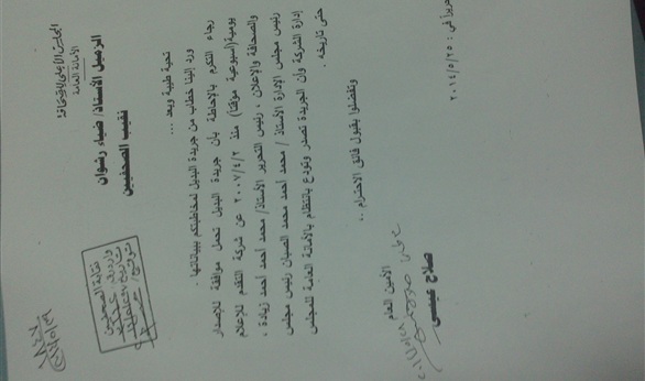 وأرفقت نقابة الصحفيين رقما للخطاب والذي حمل رقم 3142 بتاريخ 29/5/2014، مع وجود توقيع الموظف المختص .