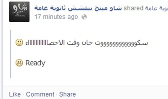 ومع بدء الامتحان.. نشر أدمن صفحة "شاومينج بيغشش ثانوية عمة" رسالة نصها: "سكووووووووووووت حان وقت الإحصاااااااااااااء"، في إشارة منه لبدء الاستعداد لنشر الأسئلة والإجابات أثناء وجود الطلاب داخل اللجان، حتى يساعدهم على عملية الغش الالكتروني.