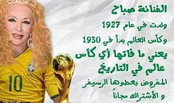 رفضت بشده اسرة الشحرورة صباح، اليوم الخميس، السخرية التى تنال الشحرورة على مواقع التواصل الاجتماعى، حيث تم نشر صورة لصباح وهى ترتدى الزي الكروي لمنتخب البرازيل ومكتوب عليها"صباح من مواليد 1927، واول كأس عالم اقيم في 1930، و بذلك لم تفوت صباح كأس عالم في حياتها"، وتم اضافت جملة ساخرة"من حق صباح ريسيفر واشتراك لمشاهدة كأس العالم مجانا".