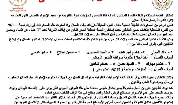 نقابة العاملين بقناة السويس للحاويات تستنكر فصل الادارة 8 دون إبداء الأسباب