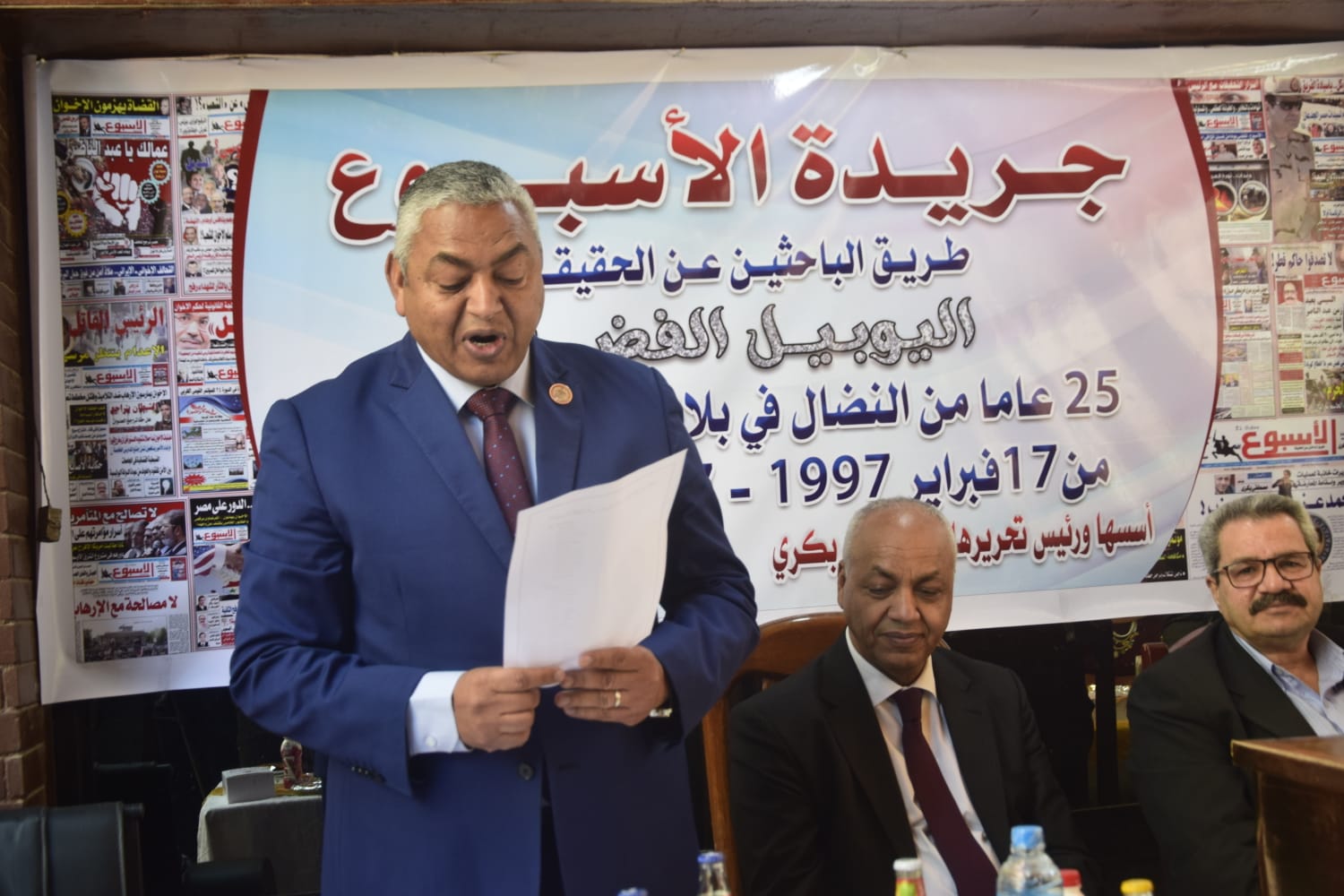 رحب الدكتور محمود بكرى بجميع الحضور فى الاحتفالية قائلا “هذا اليوم تاريخى وحضوركم مهم، اليوم نحتفل بتجربة فريدة استمرت ٢٥ عاما من النضال”. وأضاف بكرى أن تجربة الأسبوع سبقها ثلاث تجارب قاسية، مضيفا أن الجميع يطالبني باستمرار الجريدة والحمد لله ٢٥ سنة من النضال وكانت الصحيفة تقف على خط النار ، ومرينا